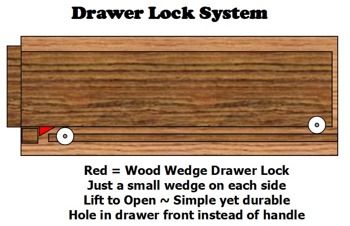 I even make the cabinets out of foam, because it’s lighter, stronger, and more durable & moisture proof than wood. Hidden, foolproof, simple, lift to open wedge type latches for drawers. Sliding cabinet doors instead of swinging ones, sliding or accordian doors for rooms.